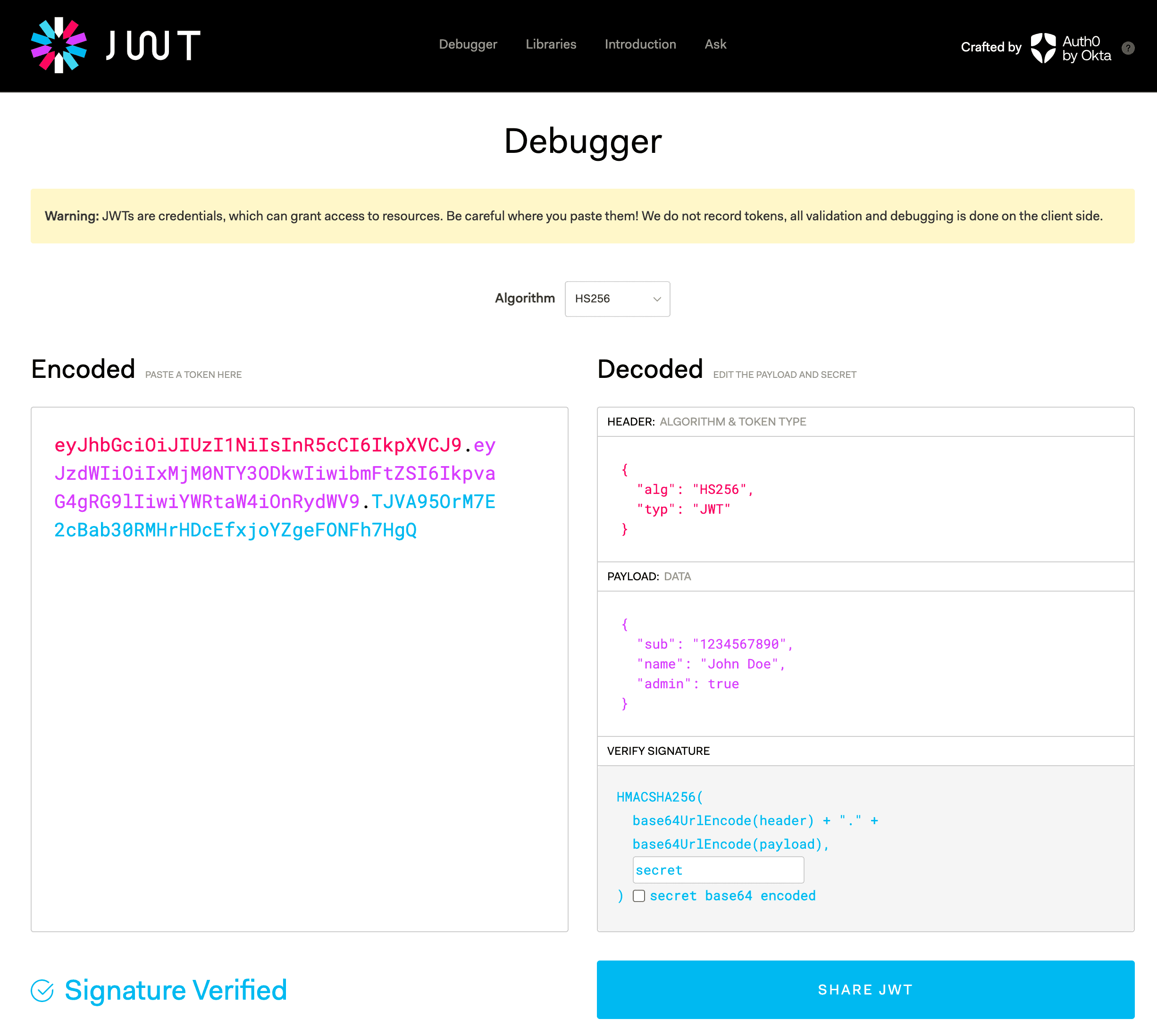 TJVA95OrM7E2cBab30RMHrHDcEfxjoYZgeFONFh7HgQ在 https://jwt.io/#debugger-io 进行解码后如下图所示,Header 中指定了使用HS256算法进行签名,令牌类型为JWT;Payload中包含了sub、name、admin信息;Signature中, 使用header和payload以及特定的secret来生成签名。