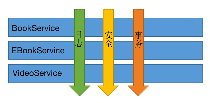 上图表示划分为三个服务模块的应用,每个模块提供相应的服务,而且这些模块都需要类似的辅助功能,例如日志、安全、事务等等。我们并不想在各个模块中写重复的日志、安全、事务的代码,那么就可以使用选用切面这个方案,来解决这个问题。