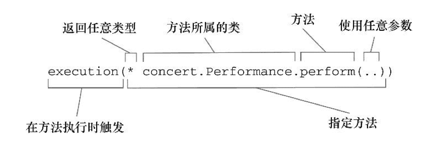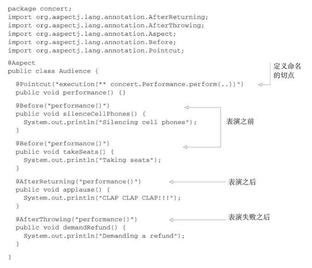 Audience类使用@Aspect注解进行了标注。该注解表明Audience不仅仅是一个POJO,还是一个切面。Audience类中的方法都使用注解来定义切面的具体行为。Audience有四个方法,定义了一个观众在观看演出时可能会做的事情。在演出之前,观众要就坐(takeSeats())并将手机调至静音状态(silenceCellPhones())。如果演出很精彩的话,观众应该会鼓掌喝彩(applause())。不过,如果演出没有达到观众预期的话,观众会要求退款(demandRefund())。