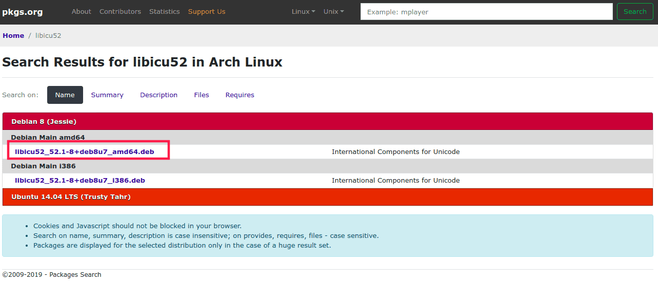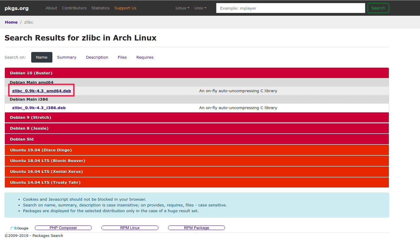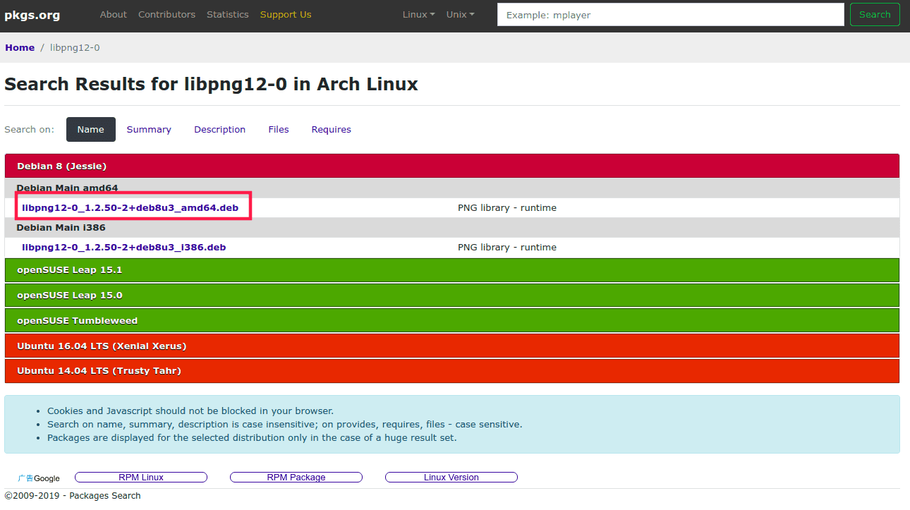 如上所示,会提示缺少依赖,到 https://pkgs.org/ 搜索依赖包,下载后双击deb文件进行依赖包的安装;