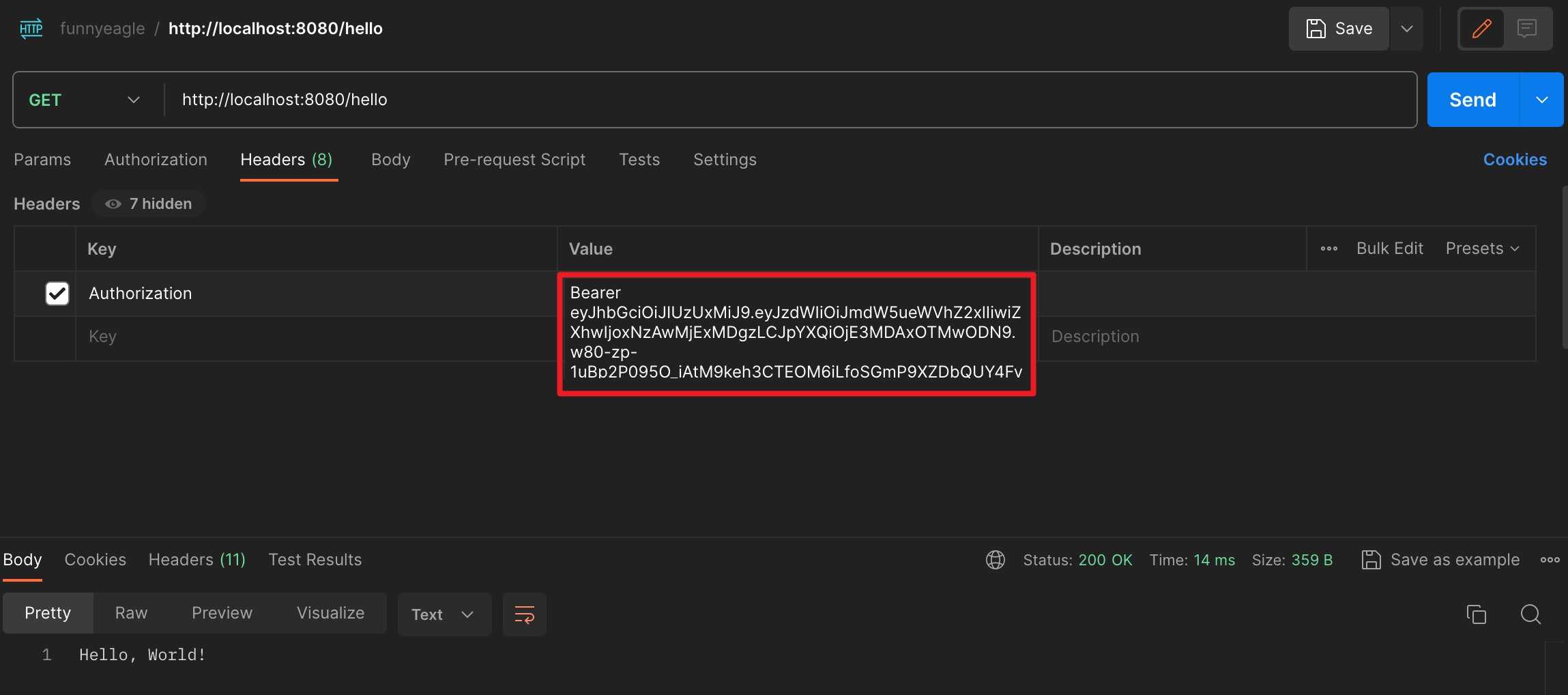 获取到token之后,在/hello请求的Header中添加 Authorization,Value的格式为 Bearer TOKEN Bearer后面有个空格。如图。