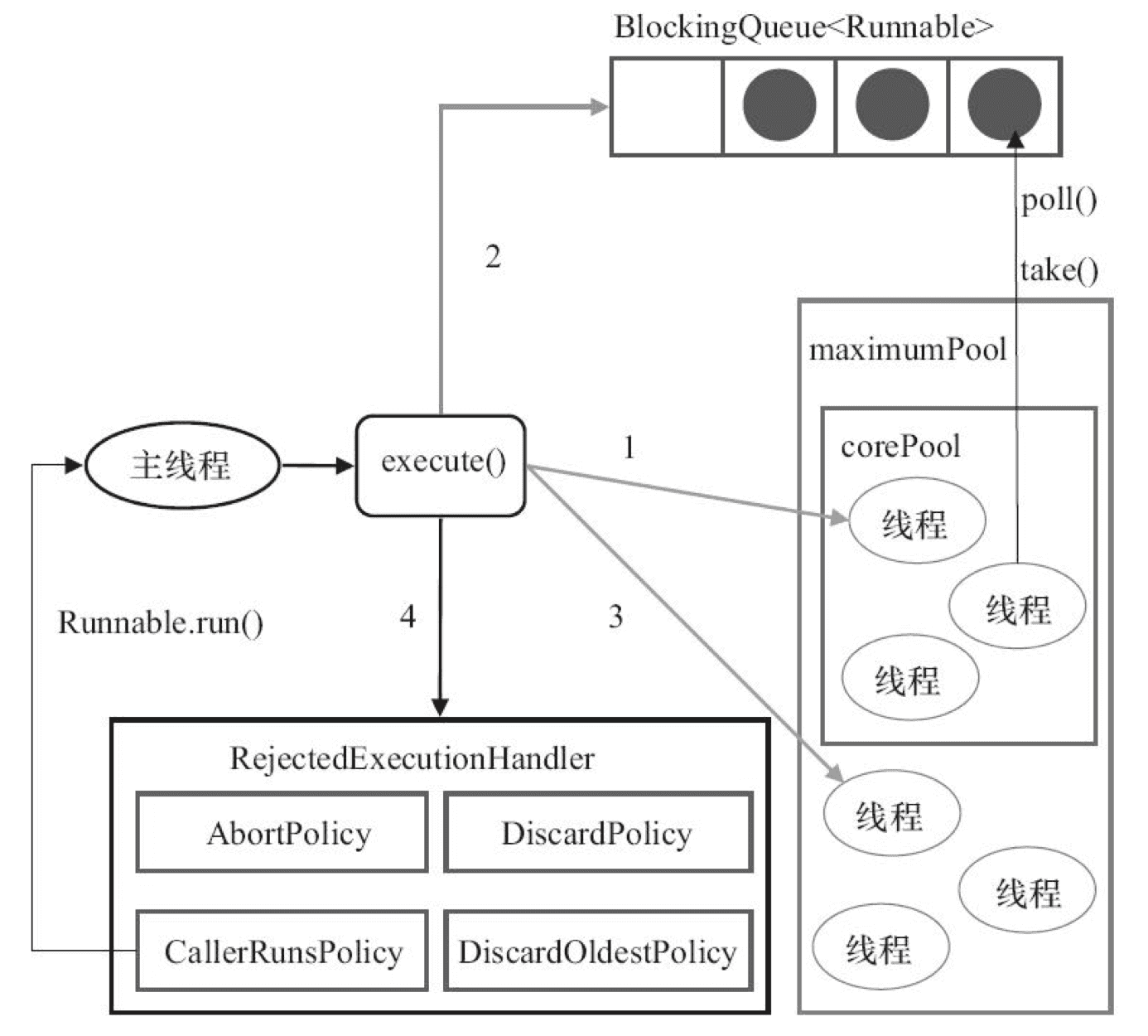 工作线程:线程池创建线程时,会将线程封装成工作线程Worker,Worker在执行完任务后,还会循环获取工作队列里的任务来执行。